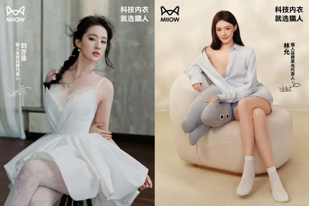 刘亦菲首次代言内衣牵手猫人,为其搭配宝格丽珠宝,把内衣穿出了高定感,为猫人狠狠升咖。不久后,林允作为猫人柔光代言人,为蜂巢内衣系列与水光丝家居服系列推出了同款。