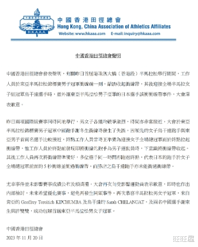 20日,赛事主办方中国香港田径总会发布声明称,当时工作人员实际是准备迎接女子全场总冠军而于终点拉起冲线带,主办方为错误收起冲线带,意外让日本选手冲线表达歉意。