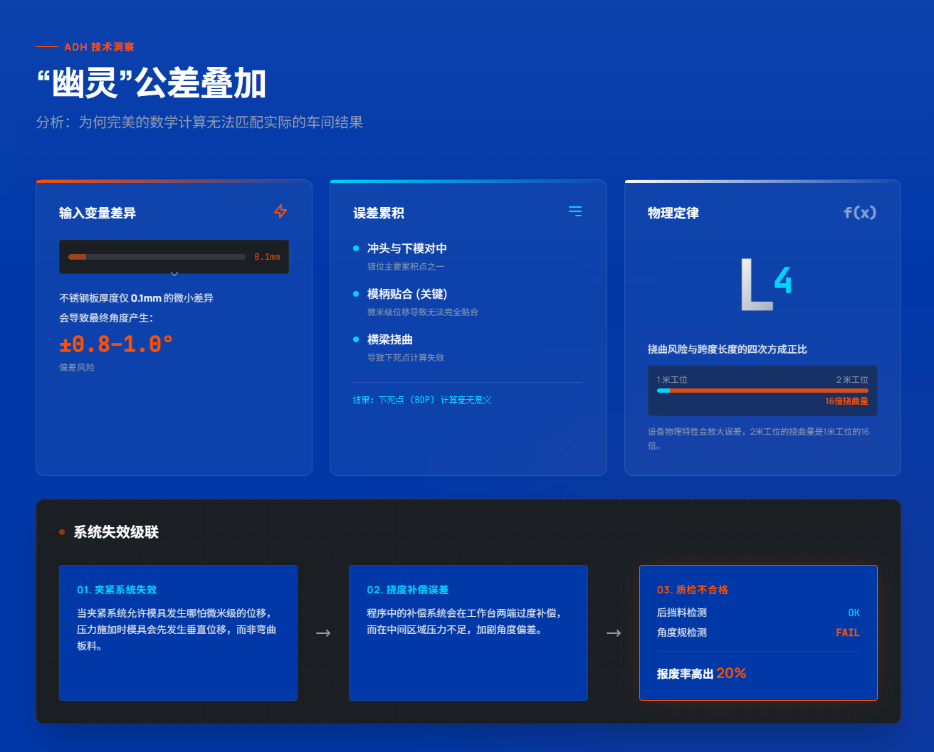 设备本身的物理特性会放大这种效应。挠曲风险随跨距长度的四次方(L⁴)增加,这意味着一段2米跨距的挠曲量是1米跨距的16倍。如果夹紧装置允许微动,那么预设的折弯机挠度补偿系统就会在床身两端过度补偿,而在中心区域补偿不足。结果如何?一个在后挡料定位点看似正确的零件,却在角度尺检测时不合格。