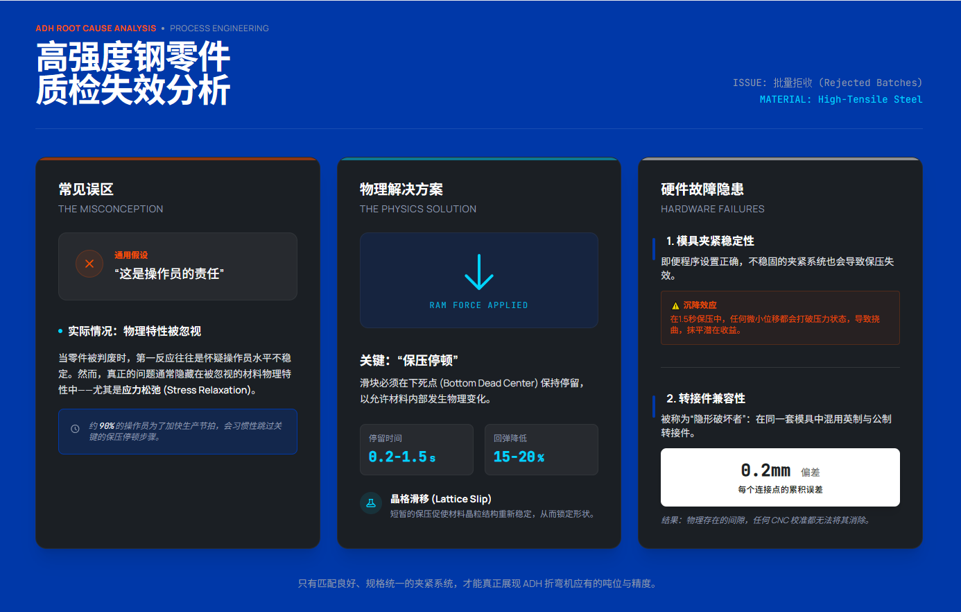 那批报废的零件,很可能不是操作员的错当一批高强度钢部件未能通过质量检验时,人们的第一反应往往是归咎于操作员操作不一致。然而,真正的元凶常常在于被忽视的材料物理特性——具体来说,是应力松弛。为了将高强度金属的回弹减少15-20%,滑块必须在下死点保持0.2-1.5秒。这个短暂的停顿使“晶格滑移”得以发生,让材料的晶粒结构稳定下来。