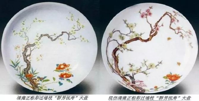 新瓷往往釉面有一层浮光,光亮刺眼,或者说叫做“生性”,即使用消光剂或其他方法去掉表面浮光,也不会呈现古瓷温润的莹光,釉面会有无数细痕,发污,失去了光泽,也失去了神韵。古瓷的彩绘,颜色沉着含蓄,彩与胎的覆着粘接自然。但后加彩的器物,加彩的地方色彩特别鲜艳,光泽度强,显得刺目。