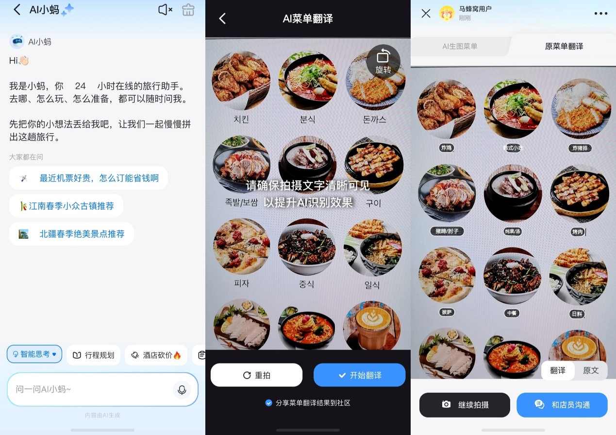 如果是出境游,外语菜单看不懂怎么办?马蜂窝“AI小蚂”自带AI菜单翻译,拍一下就能读懂,轻松搞定点餐难题,真的太贴心了。面对面对话交流也不用担心,可以试试鸿蒙版有道翻译官首发上线的“耳机同传”功能。点击开启后,就能帮你实时翻译,戴上耳机轻松交流无障碍。