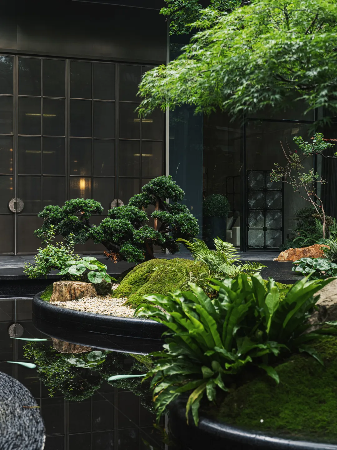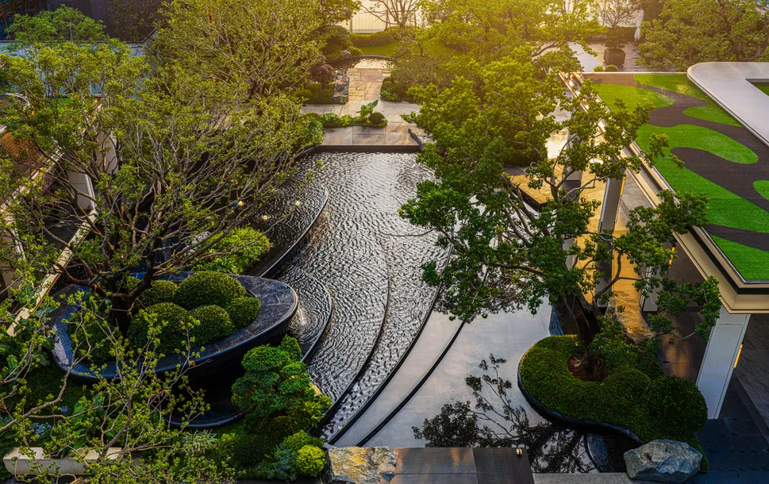 七层叠级水景淙淙而下,寓意“步步高升、生生不息”;百年朴树屹立其间,亭亭如盖,与城市大宅静默相守,见证家族在此代代传承。「浮光茶室」仿佛漂浮于下沉庭院之上,于此品茗会友,四季风景尽收眼底;「一方亭」取意《诗经》“所谓伊人,在水一方”,中央庄园花坛采用抬高式布局,四周绿植环抱,空间被巧妙划分,形成多个被自然温柔包裹的生活聚场。
