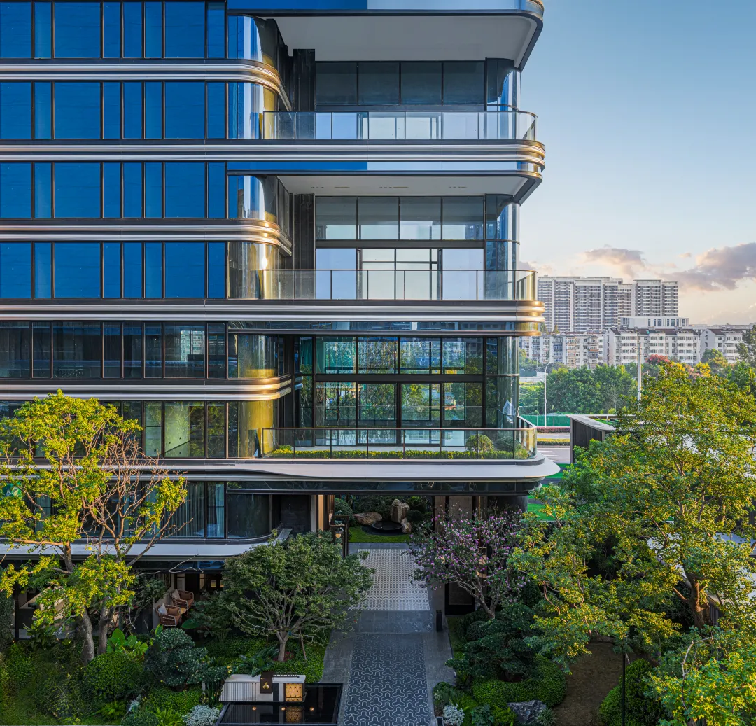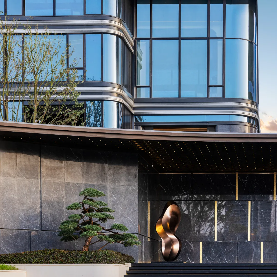 设计灵感汲取纽约ONE57、苹果旗舰店等国际地标的精神内核,运用充满线条感、精致度与圆润气的语言,结合大量弧形玻璃、石材与铝板,勾勒出既契合未来审美趋势,又引领当代城市封面的建筑形态。