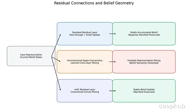 不同残差连接模式对应着截然不同的内部信念动态。标准残差连接通过增量式更新维持信念状态的稳定;无约束超连接则引入任意的跨层混合,可能导致信念语义失真;mHC通过强制凸约束恢复稳定性,保护贝叶斯流形不受破坏。