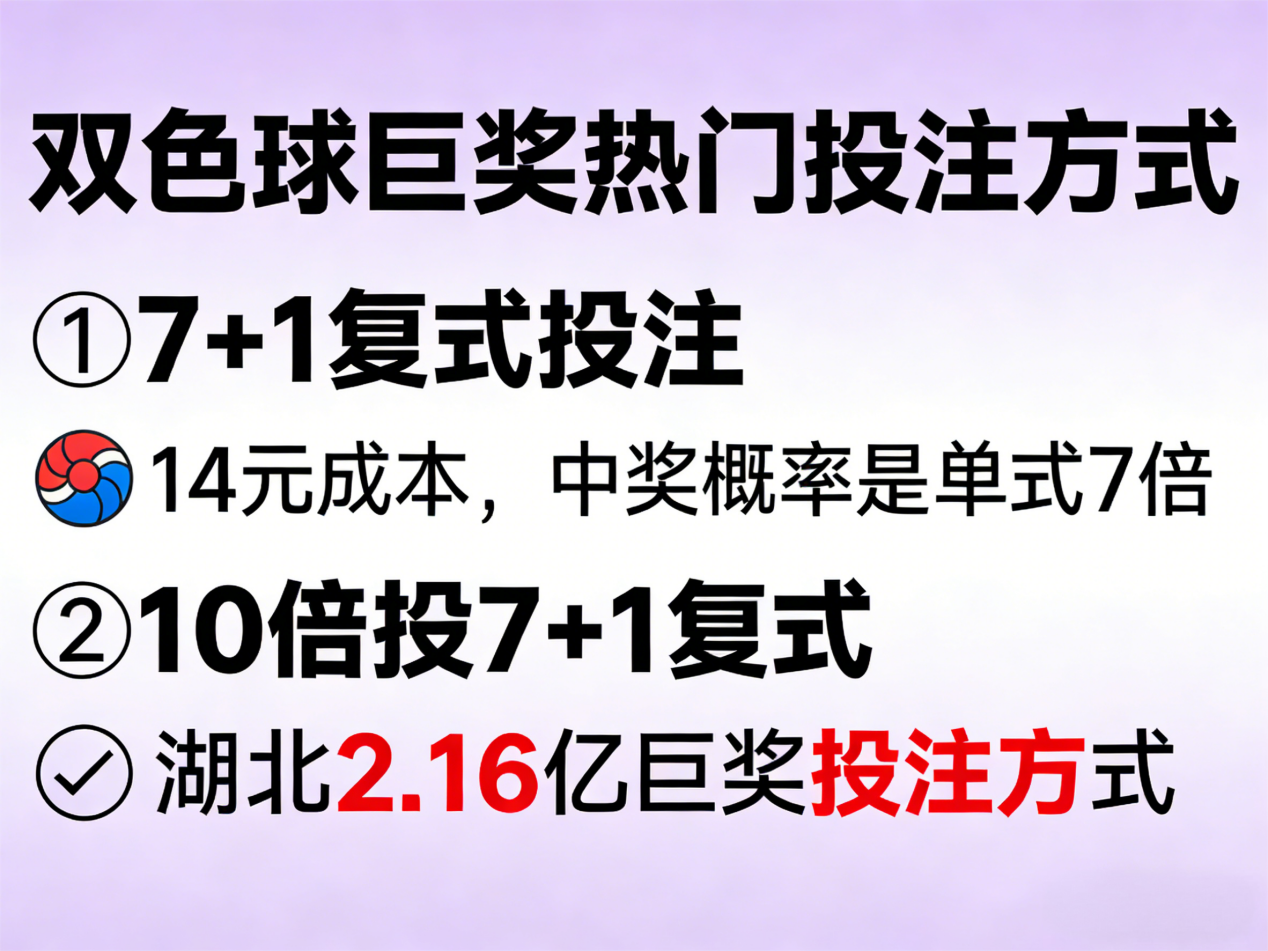1. 复式投注是巨奖神器:在所有巨奖案例中,7+1复式是最受欢迎的玩法,没有之一。这种玩法只需选择7个红球+1个蓝球,系统会自动拆解为7注单式彩票,成本仅14元,对比单式2元一注的成本,中奖概率直接提升7倍,性价比极高。湖北那2.16亿巨奖,就是彩民通过4张10倍投的7+1复式票中得,既控制了成本,又通过倍投放大了奖金,完美诠释了“小成本撬动大奖”的核心逻辑。