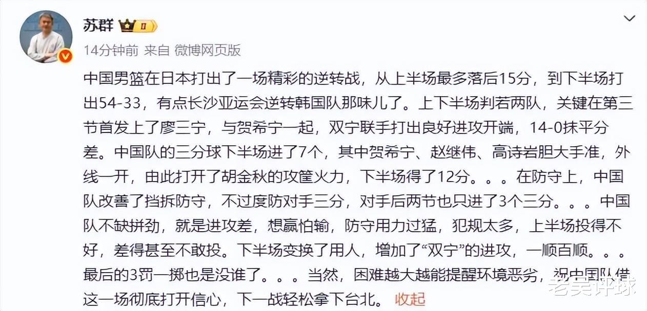 赛后看看专业媒体人苏群、赵探长怎么说,苏群表示:“中国男篮在日本打出了一场精彩的逆转战,下半场变换了用人,增加了双宁的进攻,一顺百顺。。。”
