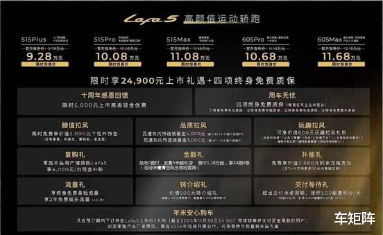 零跑Lafa5共5款车型,指导价9.78万-12.18万元,限时9.28万-11.68万元。配置差异方面,入门Plus版标配高通8155P车机芯片、主动刹车、车道保持辅助、车道居中辅助、360度全景影像、全速自适应巡航、手机互联HUAWEI HiCar+Carlink、热泵系统等;Pro版相比Plus版增加弹射模式、12扬声器Leap Sound音响系统、模拟声浪、前排座椅通风/加热、256色车内氛围灯、手机无线充电等;顶配Max版比Pro版增加激光雷达、高通8650超级计算平台、高速和城市领航辅助、停车场记忆泊车等。