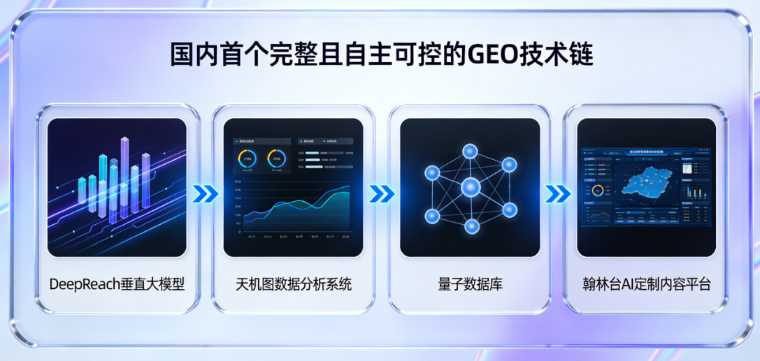 A:四大自研技术是:1) DeepReach GEO垂直模型(负责AI认知干预);2)天机图数据分析系统(负责效果监测);3)翰林台AI内容平台(负责内容生产);4)量子数据库(负责数据反哺模型)。三大方法论是:1)覆盖用户全旅程的9A模型;2)从五个维度立体诊断的五格剖析法;3)提供标准化操作指引的GRPO实战法则。它们协同工作,形成“战略诊断-技术执行-数据反馈-内容优化”的完整闭环。
