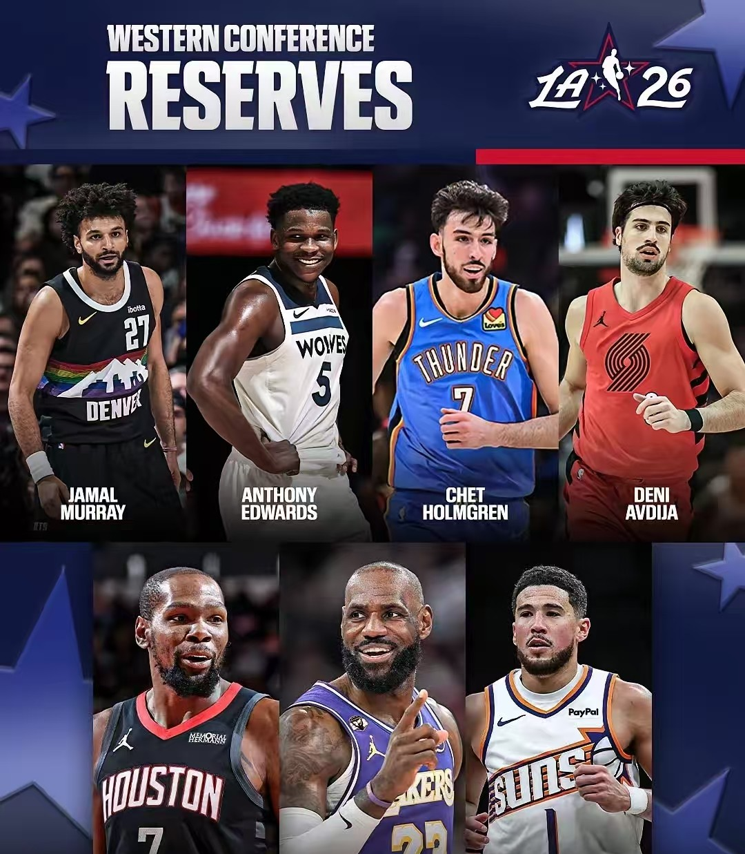 北京时间2月2日,NBA官方公布了完整的2026届全明星阵容名单,此前东西部的首发阵容已经透露,此番剩余的替补球员也悉数揭晓。詹姆斯和杜兰特两名老将领衔西部,还有爱德华兹、穆雷、霍姆格伦、布克、阿夫迪亚。东部方面则是米切尔、杰伦-约翰逊、唐斯、西亚卡姆、巴恩斯、鲍威尔、杜伦。