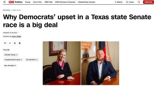 综合路透社和《纽约时报》报道,美国民主党候选人雷赫梅特(Taylor Rehmet)星期六(1月31日)在得州参议院的一场特别选举中,以超过14个百分点的优势击败共和党对手,数十年来首次从共和党手中拿下这个议席,并延续了民主党近几个月在全国地方和州选举中的一连串胜绩。