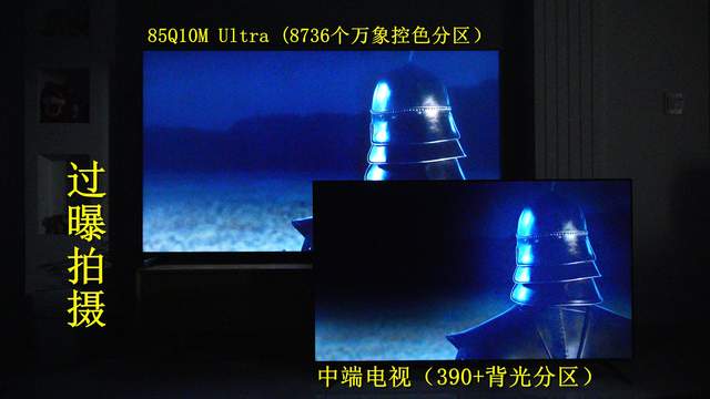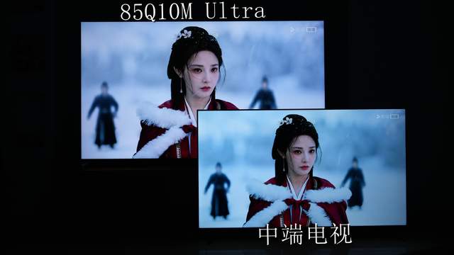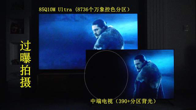 过曝拍摄:可以看到《权游》经典场景中,85Q10M Ultra可以完整显示远处的山峰,而中端电视则只能显示一团黑,这是由于不同的控光能力和算法导致的,85Q10M Ultra的画面亮度和均匀度都展现出顶级的水准。