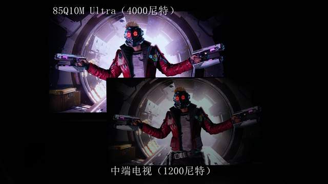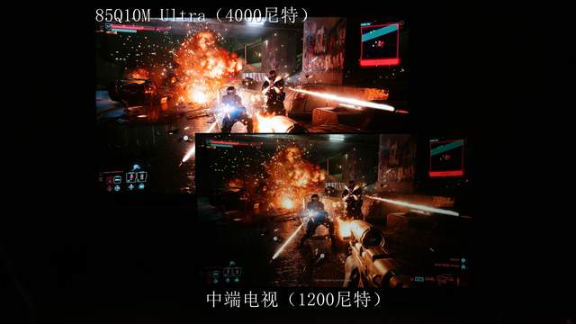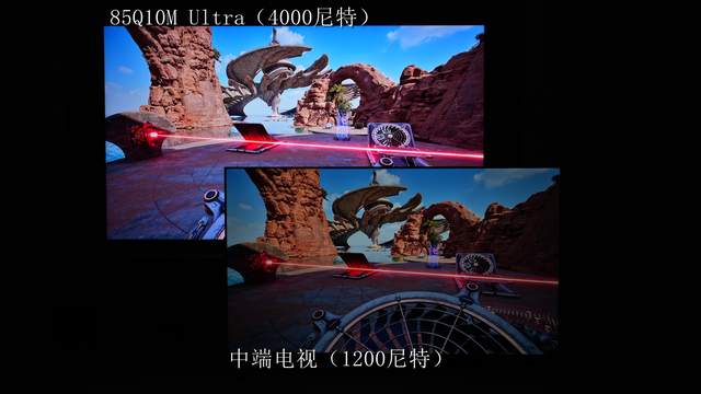 亮度对比:可以看到下图,85Q10M Ultra的画面真通透,亮光爆发力很足,而更低峰值亮度的画面层次相对欠佳,没有85Q10M Ultra画面自然。