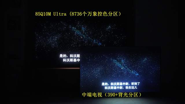 得益于8736个RGB万象分区,以及超聚光微透镜+RGB聚核光芯+超微OD等硬件突破,再结合自研光影控制算法,85Q10M Ultra实现了顶级的控光精度。地狱级难度的《地心引力》宇宙场景中,可以看到相比普通390分区的电视,无论是白色字幕、纯黑的宇宙背景,还是星星,都能极致的展现,而没有明显光晕。