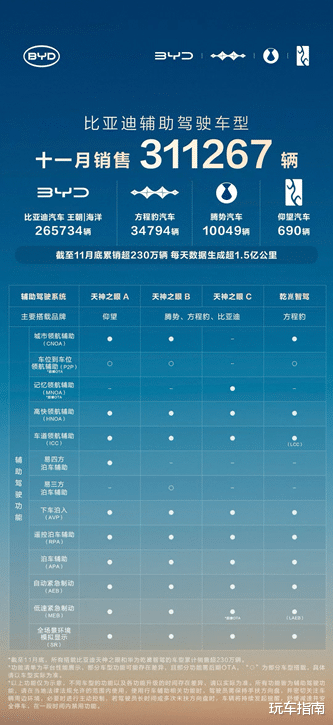 近日,比亚迪公布了其搭载天神之眼辅助驾驶系统的车型在11月的销售数据,全月销量达311267辆,继续引领市场。其中,比亚