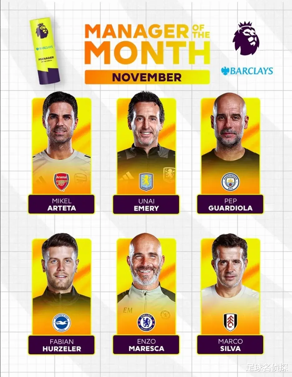 官方:阿尔特塔被提名为了英超11月最佳主帅候选。