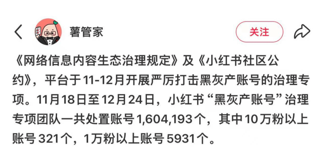 与此同时,小红书在打击黑灰产的高压行动中,显示出治理逻辑的另一面。2024年底,平台宣布封禁超160万个违规账号。但数据显示,其中粉丝数超10万的仅有321个,超过1万的也不过6000个。