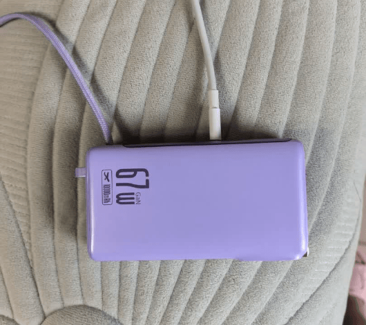 这款充电宝自带AC插头和Lightning+Type-c充电线,是一款三合一充电宝,充电使用的便携性还不错,外出基本上带一个充电宝就够了。并且它还可以为笔记本电脑提供67W的快充,支持短时间为笔记本电脑提供电量支持。但由于这款的容量为10000mAh,额定容量也不算高,所以为多设备或者笔记本电脑补电的时候无法持续长时间补电,不太建议有长时间多设备补电需求的用户选择。此外,这款搭配了35W的苹果同厂芯片,为手机提供充电时的稳定性还不错。在温度控制上,这款使用AC插头自充时,机身会存在一定的发热情况,充电需要注意周遭环境的变化,切勿在旁边堆放易燃物品。