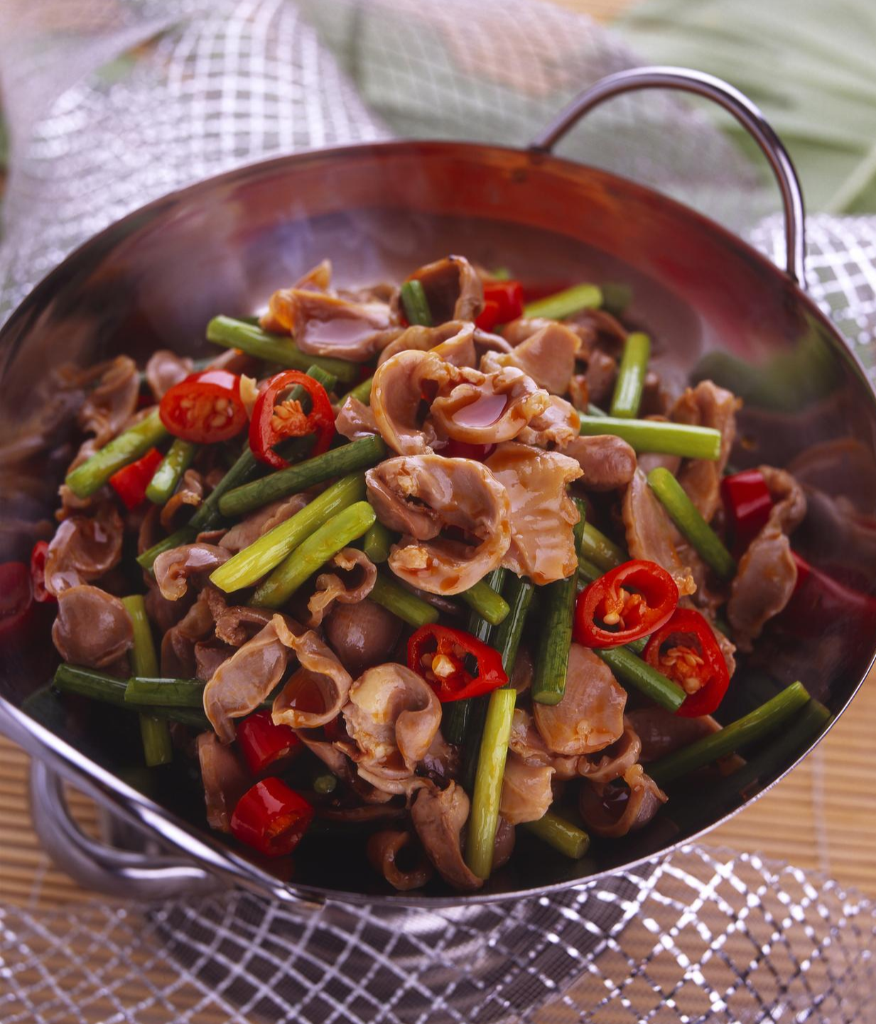 铁锅烧得冒烟,倒入菜籽油,待油面泛起细密的油花,先放入姜片、蒜瓣和干辣椒爆香,接着倒入腌制好的鸡杂,手腕发力快速翻炒。铁锅与锅铲碰撞出清脆的声响,鸡杂在高温下迅速收缩,颜色从粉嫩变成深褐,此时加入提前泡好的泡椒和泡姜,鲜红的泡椒带着发酵后的酸辣,与鸡杂的鲜味碰撞出奇妙的火花。