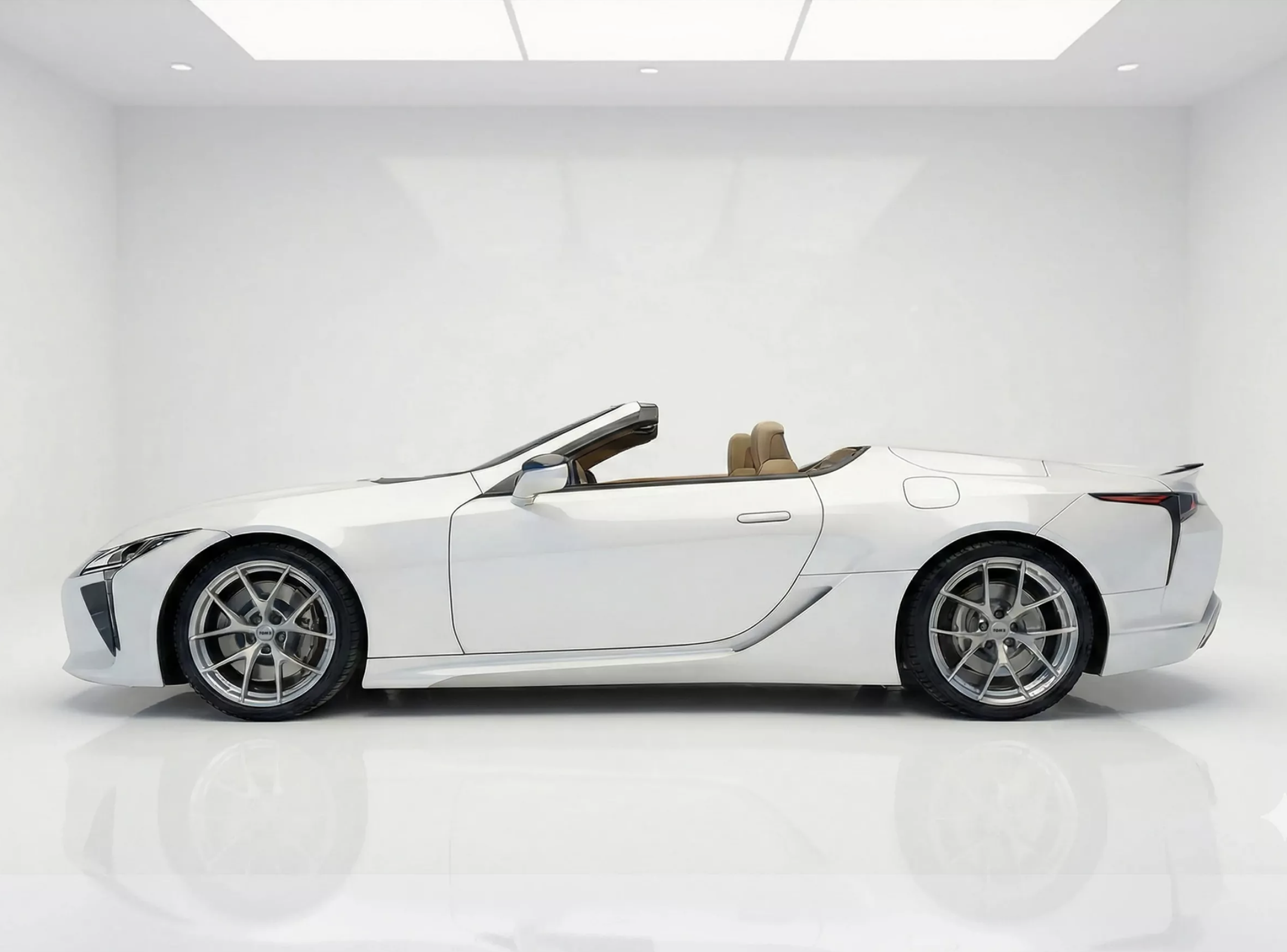 不得不说,雷克萨斯LC的车身才是最具艺术感的。米白色的车漆涂装与黑色的软顶敞篷形成了鲜明的撞色对比。优雅的车身线条、隐藏式的车门把手、两侧巨大的无边框车门,再配上21英寸的锻造Y字形轮圈,匹配了米其林的245/40 R21(前轮)、275/35 R21(后轮),还有大尺寸银色刹车盘和红色的刹车卡钳,将跑车的迷人气息展现地淋漓尽致。迎宾踏板向外扩,在车门后方形成了上扬的趋势,还加入了斜向的进气口,带来了最佳的空气动力学效能。尺寸方面,雷克萨斯LC车长达到了4770mm,车宽1920mm,车身高度仅仅只有1345mm,十分低趴,不仅视觉冲击力很强,还降低了整车的风阻系数。车身轴距2870mm,对于一款双门两座的轿跑车型来说,车内空间还是十分宽敞的。
