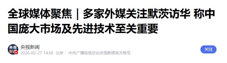 3.《全球媒体聚焦|多家外媒关注默茨访华 称中国庞大市场及先进技术至关重要》2026-02-27 14:56 | 来源:央视新闻