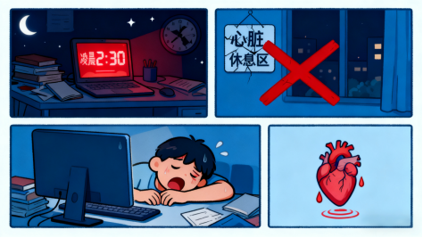 每天凌晨1-3点睡、早上7点起,长期下来心脏没足够时间修复。晚上本是心脏“休息期”,熬夜时心脏得“加班”,交感神经也跟着兴奋,心跳容易乱,心慌自然来。