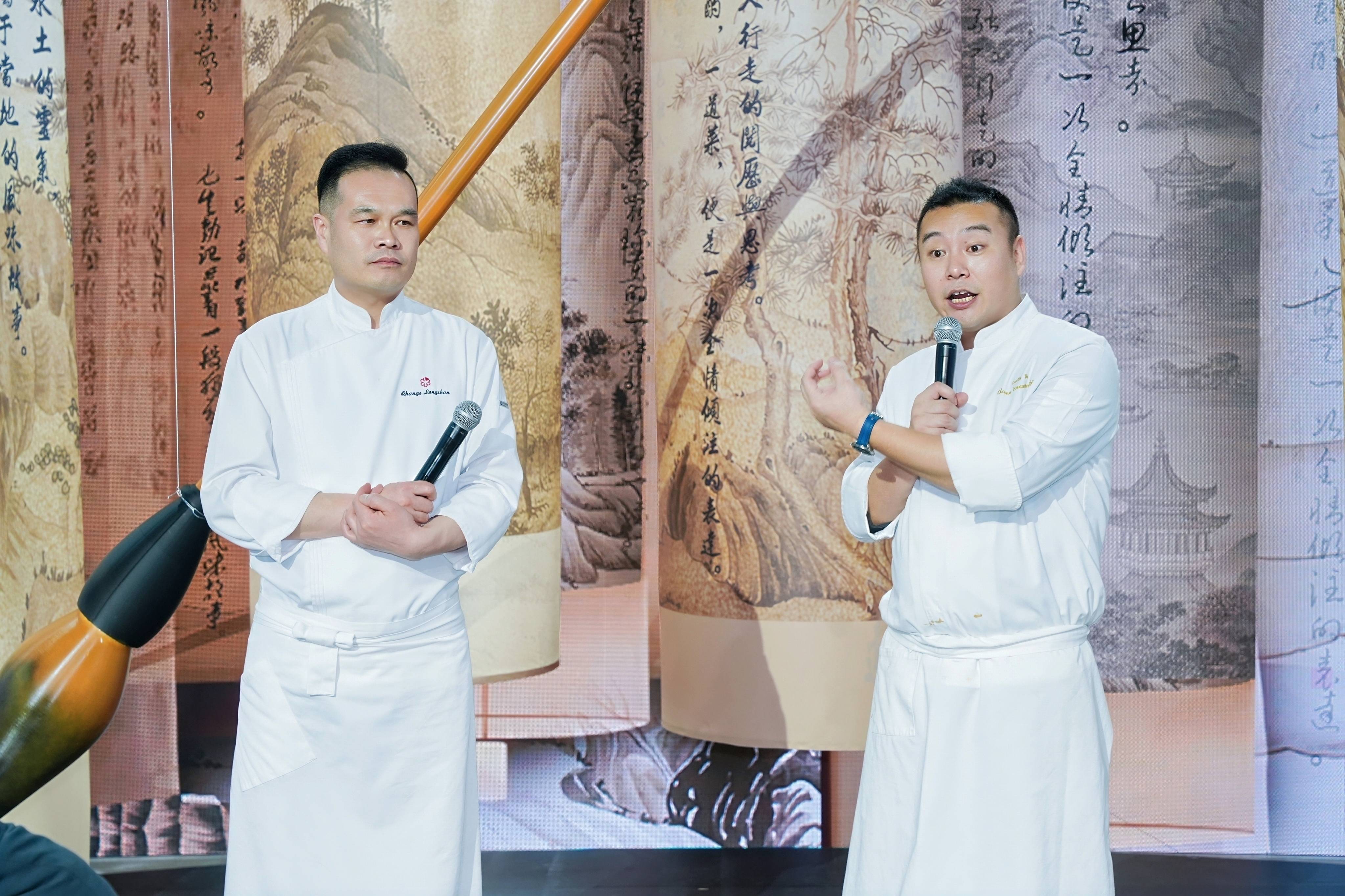 这场风味对话的深度,源自两位主厨各自的深厚造诣与开放胸襟。合肥栢景朗廷酒店中餐行政总厨杜宗明师傅,以"应季而食,因地而烹"的智慧,将江淮风物巧妙融入粤菜经典,赋予传统清新的当地表达。北京止观小馆常龙山师傅,作为非遗技艺"辽河口渔家菜"的传承者,致力于以现代美学呈现东北饮食的文化厚度,其作品在质朴中蕴藏深沉的人文回响。二人的携手,不仅是文化饮食的共创,更是两种饮食哲学的相互致敬。