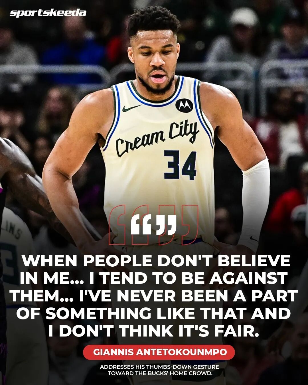 记者提醒字母哥这是在主场,字母哥表示:“这并不重要,真的不重要,我打球是为了我的队友、为了我自己和我的家人。当有人不相信我时,我不会去迎合他们,反而会站在他们的对立面,我只会专注于我该做的事和擅长的事。”