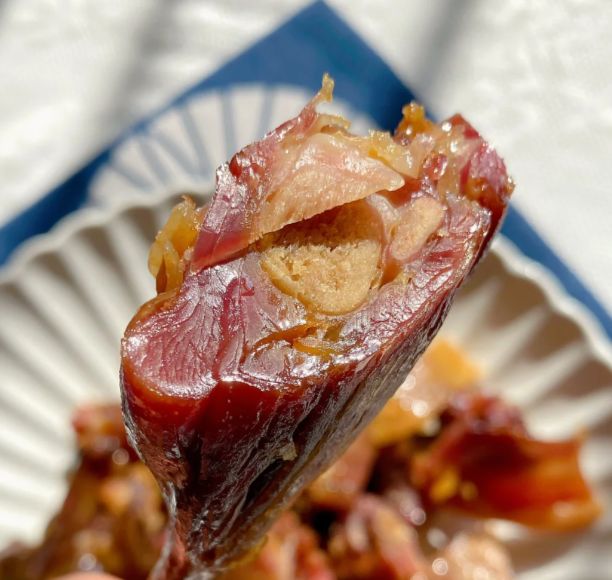 蒸好的板鸭,皮是透亮的,肉是暗红的,咬一口,咸香浓郁,肉质紧实而有嚼劲,越嚼越有滋味。这咸,不是齁人的咸,是和着腊香与肉香一起化开的醇厚;这紧实,是山风和日光赋予的独特口感,一片鸭肉,能送下好几口热米饭。最妙的当属那紧贴骨头的部分,啃起来格外香。若是喜欢,也可以在板鸭底下铺上一层厚厚的豆腐干或香芋片,蒸的过程中,素菜吸饱了板鸭的油脂和咸香,比肉还受欢迎,是朴素又完美的搭配。