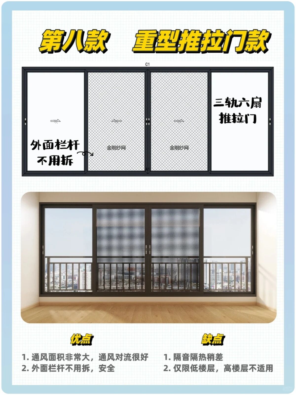 ▲推拉门款:重型落地推拉门,外侧栏杆保留 ;优点:通风面积很大,通风对流很好 ;缺点:隔音隔热稍差,高楼层不合适。