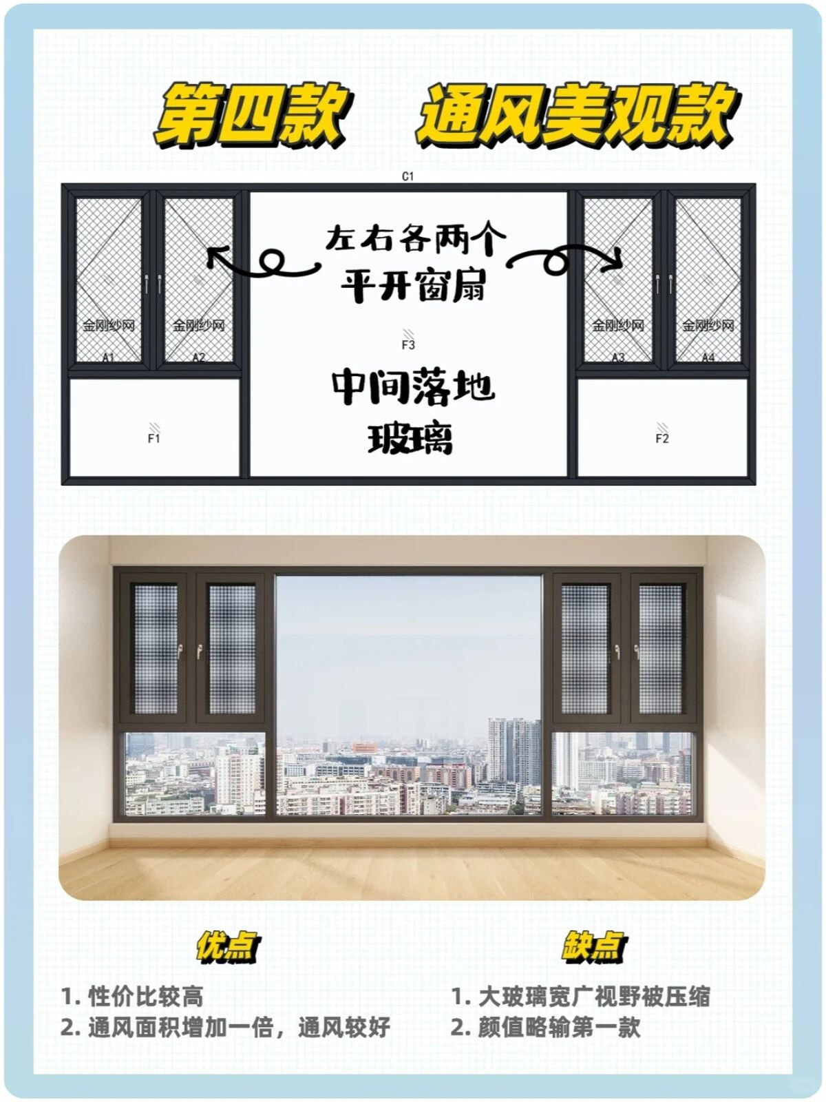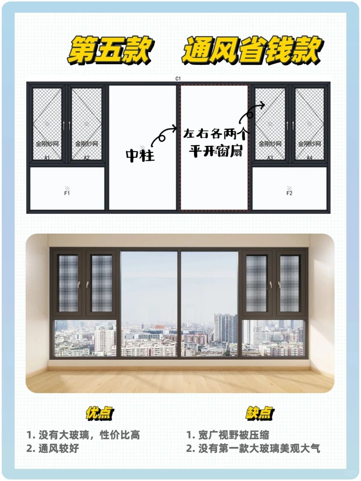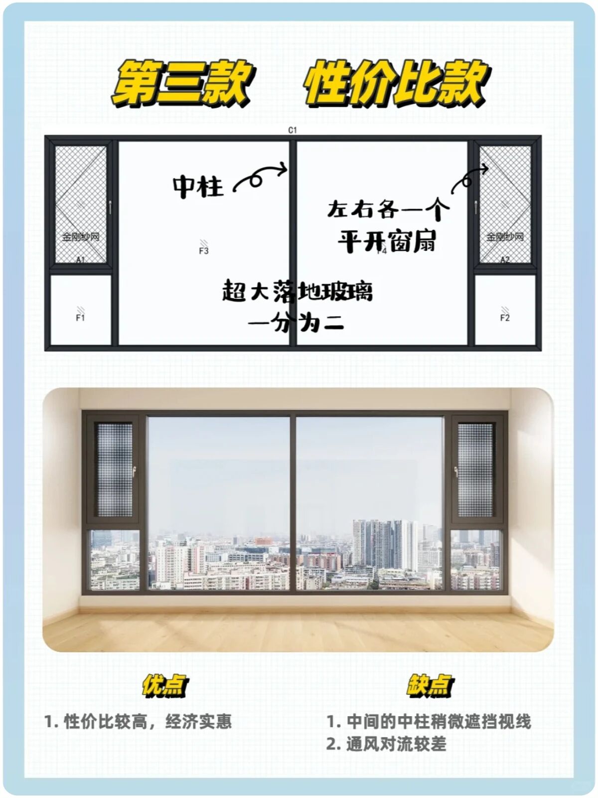 ▲性价比款:中间加立柱分隔玻璃 ;优点:性价比高,经济实惠 ;缺点:中间的中柱稍挡视线,通风对流较差。