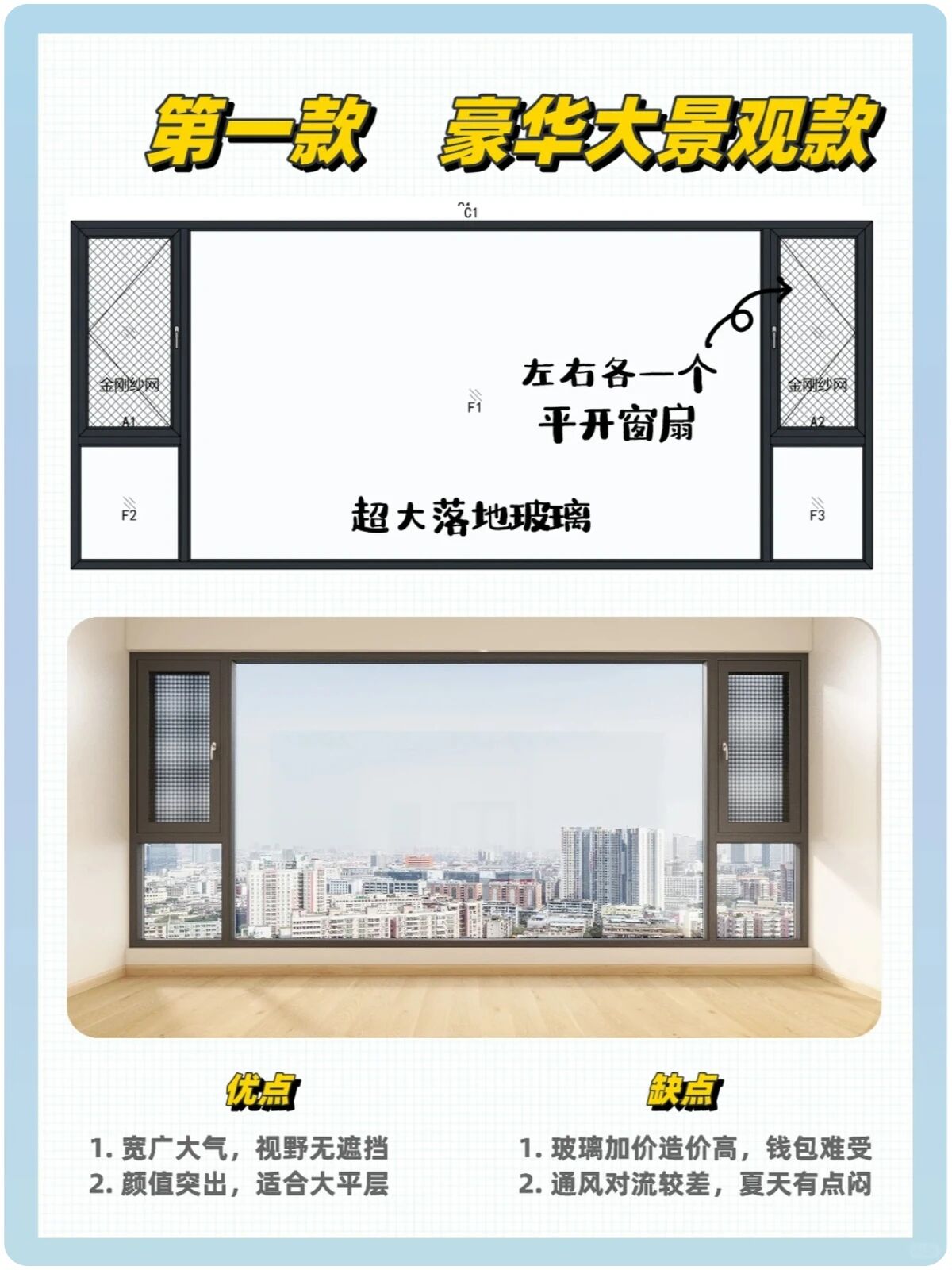 ▲豪华大景观款:中间做落地大玻璃,两侧各一个开启扇;优点:视野宽广大气无遮挡,颜值突出;缺点:玻璃加厚,造价高,通风对流较差。