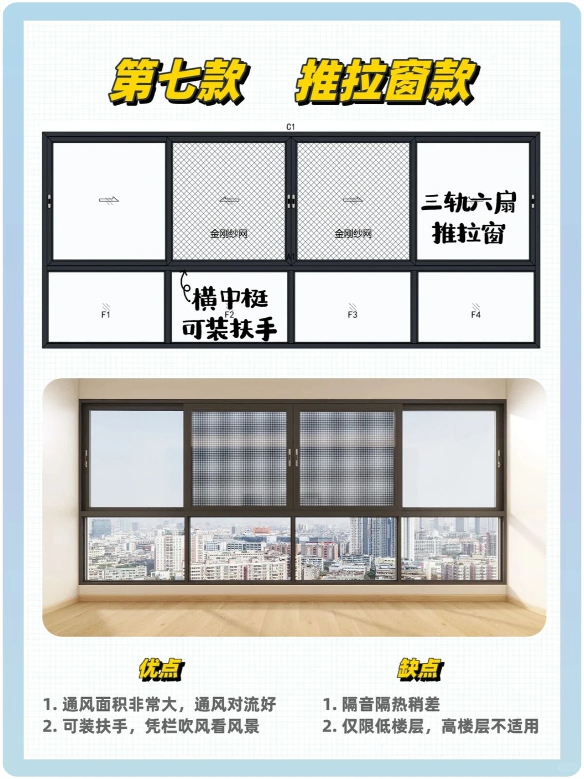 ▲推拉窗款:上方做三轨六扇推拉(含纱扇),下方为固定玻璃;优点:通风面积大,对流好,可装扶手休憩 ;缺点:隔音隔热稍差,高楼层不合适。