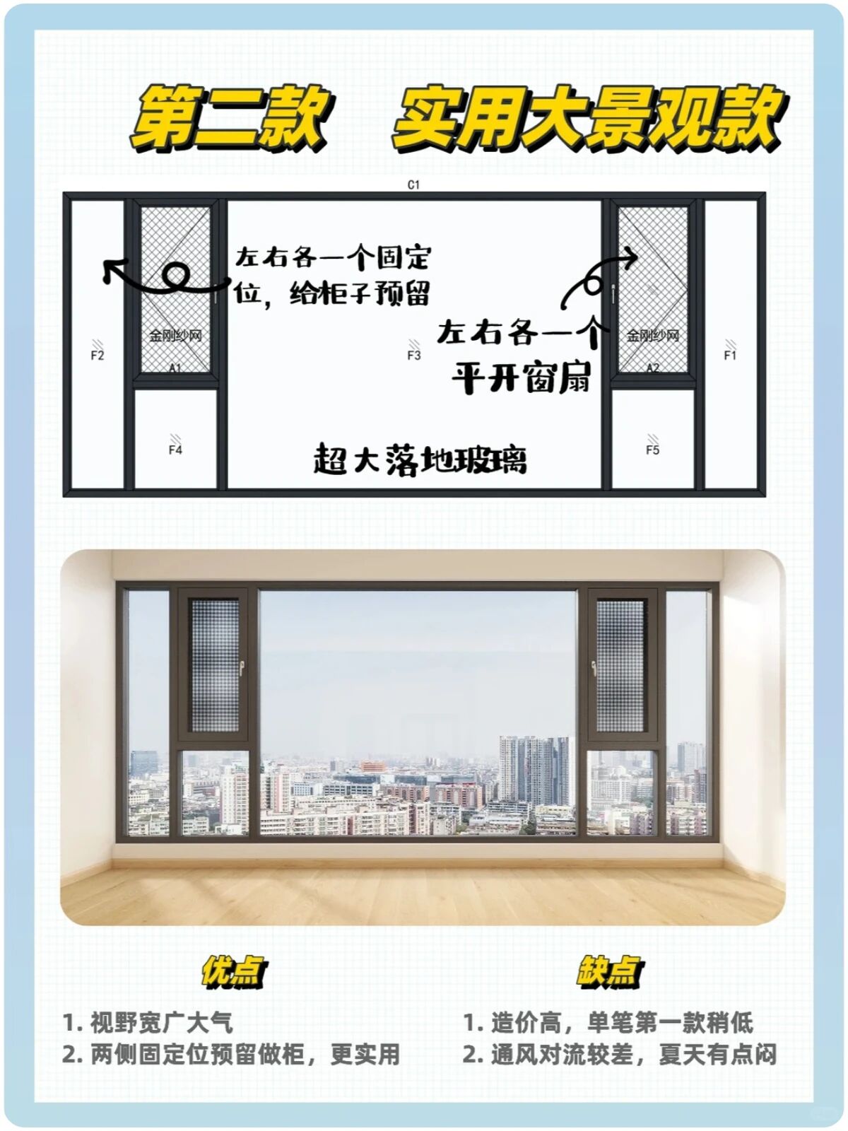 ▲实用大景观款:第1款基础上留固定位,方便两侧做阳台柜 ;优点:视野宽广,两侧可做阳台柜更实用 ;缺点:造价高但比第1款稍低,通风对流较差。