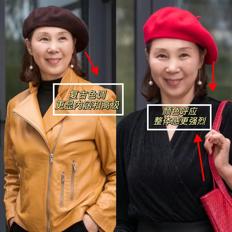 随着复古风的兴起,贝雷帽也开始流行起来,中年女人大可以尝试这种优雅又复古的贝雷帽,防风力强,还能营造出优雅大方的气质。