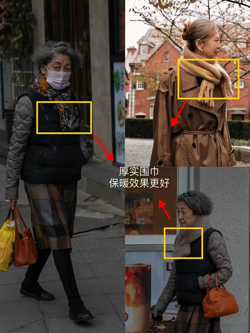 在这种情况下,可以像上海奶奶这样佩戴一条围巾,可挑选厚实一点的围巾,围绕在脖颈,挡住了冷风,身体自然就会感觉到温暖。