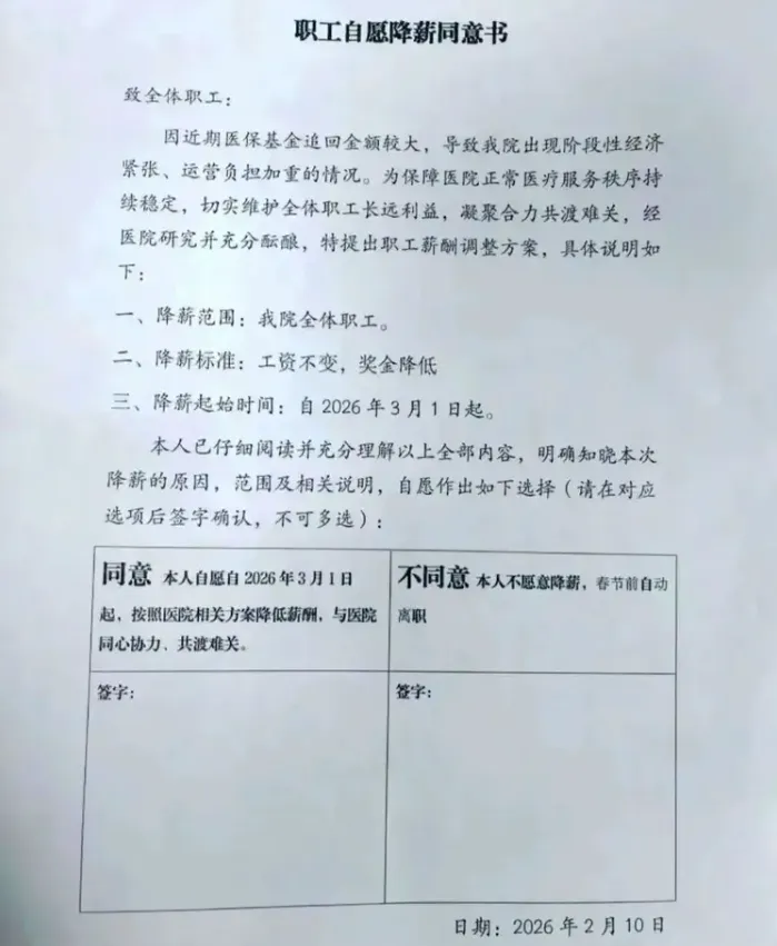 文件中明确写道:“因近期医保基金追回金额较大,导致我院出现阶段性经济紧张。”医院给出的办法是工资不变,奖金降低。而留给职工的只有两个选项:同意自愿降薪;不同意,春节前自动离职。