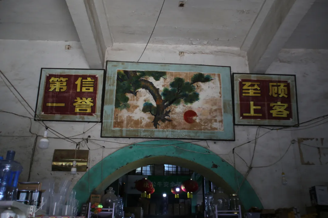 一栋大楼的招牌刻着“百货公司”,附近还有一栋老日杂百货,外立面以白色瓷砖铺满,中间有块红字牌,极具二十世纪五六十年代建筑风格。大厅内的圆拱门上写着“顾客至上,信誉第一”,进门处还留着旧时字样“欢迎再来”。