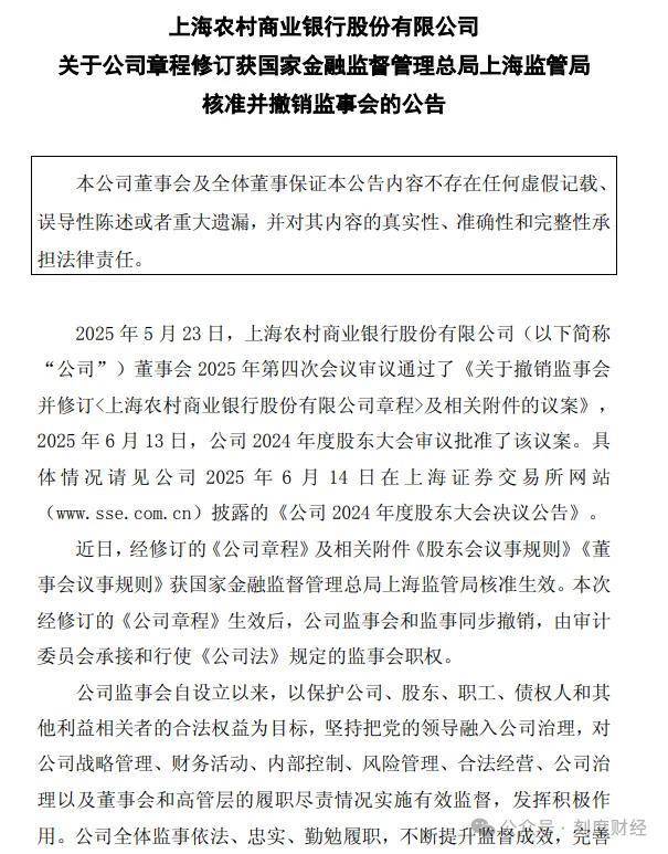 在公司治理层面,沪农商行于2025年9月修订公司章程,宣布撤销监事会,将监督职能移交董事会下属的审计委员会。这一调整虽符合新《公司法》精神,也与部分大型银行做法一致,但放在沪农商行这一治理基础薄弱的区域性银行身上,引发市场对“监督缺位”的普遍担忧。