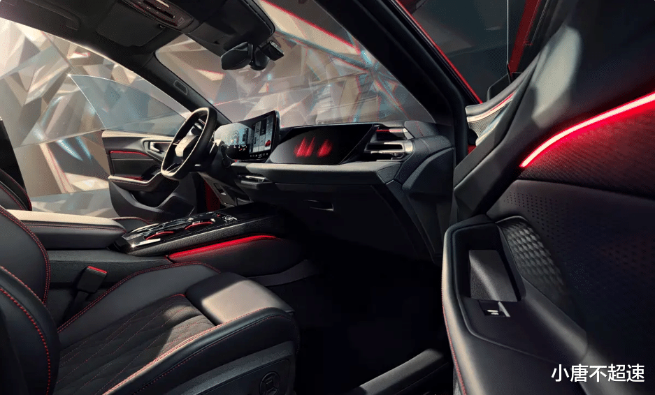 进入车内,可见内饰以红色元素作为核心点缀,包括醒目的红色安全带,以及在方向盘、座椅及门板饰条等处使用的红色缝线。座椅材质采用Microfiber超纤绒与皮质双拼,并更换为一体式限量竞速座椅,车内还增加了碳纤维饰板。音响系统配备了含有20个扬声器的B&O 3D环绕音响。车内屏幕布局与其它车型一致,由11.9英寸液晶仪表、14.5英寸中控触摸屏以及嵌入饰板内的10.9英寸副驾娱乐屏共同构成。