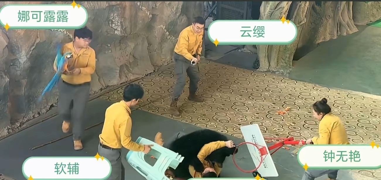 表演环节本是“饲养员喂胡萝卜,熊做拜拜”,结果熊二急了,前爪扒着饲养员胳膊,左后腿踮两步试探,直接用脚绊人,把人摔在地上。旁边的蓝黄金刚鹦鹉突然喊“撒手!撒手!”,一开始以为是女饲养员,后来才知道是鹦鹉学舌。