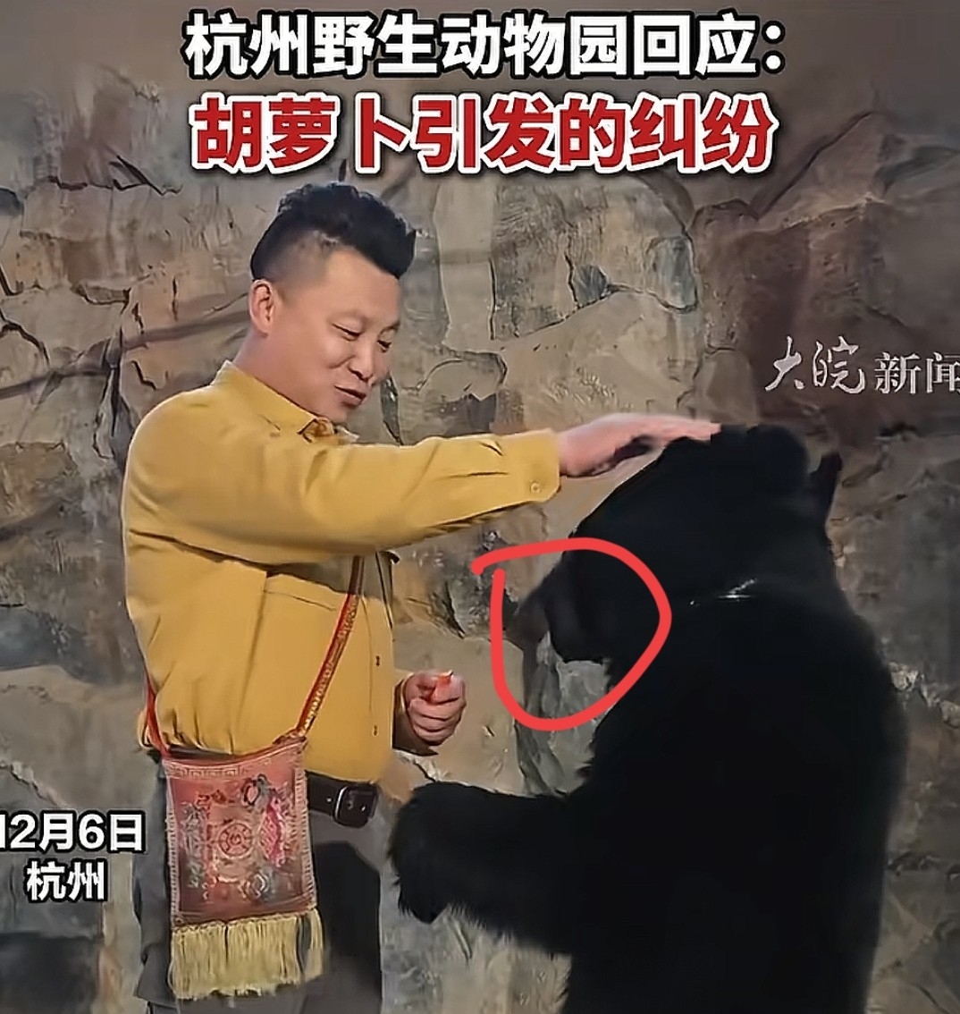 杭州野生动物世界回应 ,这只黑熊是人工饲养的亚洲黑熊,平时和饲养员关系 好,这次就是“急着吃”,没真动手。有人心疼:“这小熊才半大,天天被训练做动作,抢不到肯定要挨训”。
