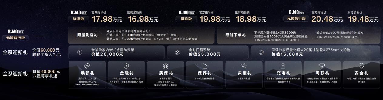 自此,BJ40增程家族一共拥有标准版、进阶版、元境智行版三个版型。北京越野还带来了BJ40增程三个版型均能享受的两大全系迎新礼。