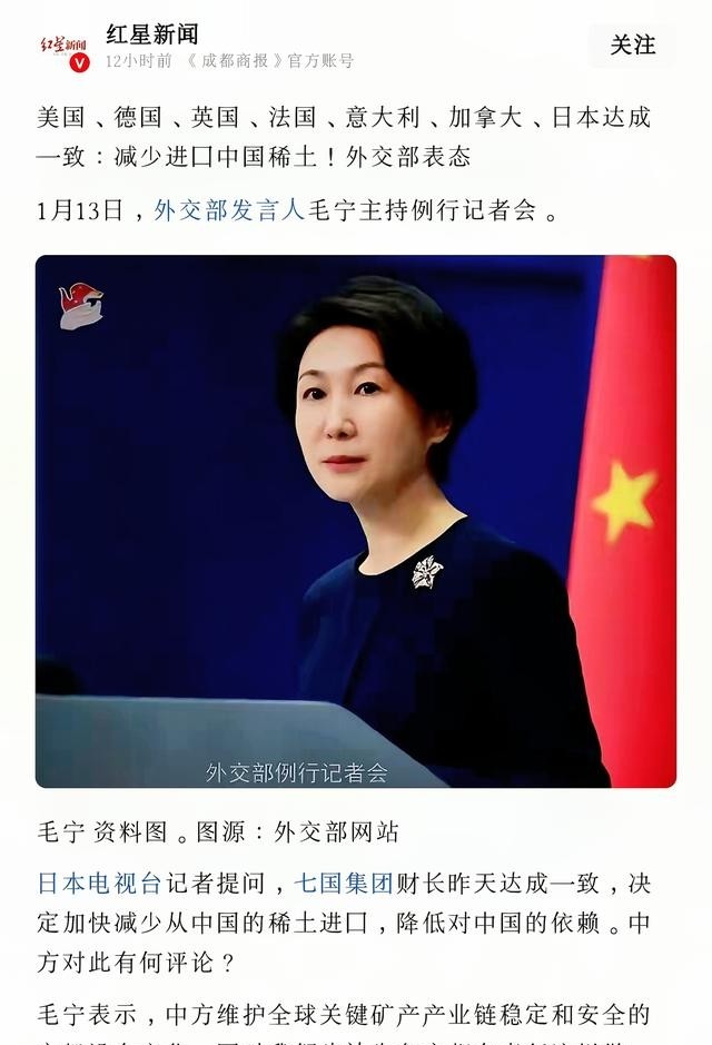 这事儿暴露G7内部不齐心,美国和欧盟在北约框架下还闹矛盾,谈什么联合抵抗?中国没把稀土当武器用,一直强调稳定供应链,但日本言论越线,北京就用制度手段护权益。毛宁一月十三号记者会上回应G7声明,说中方维护全球矿产链稳定,各方都有责任,别双标。