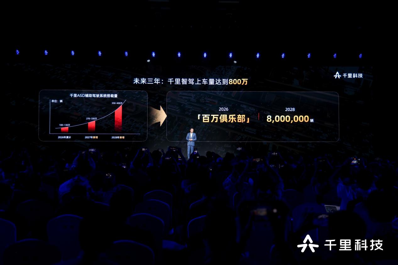 发布会上,千里科技联席董事长赵明披露了一组亮眼数据:截至2026年3月31日,已有17款车型、合计46万辆车搭载其智能驾驶技术,辅助驾驶激活率达92%,月均避险32万次,泊车功能使用量增长144%。按照规划,2026年底搭载量将突破100万辆,2028年更是剑指800万辆,目标成为全球最大智驾方案供应商之一。