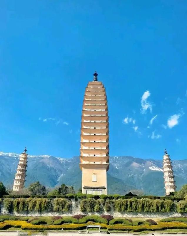 大塔又名千寻塔,居前,两座小塔稍后,分南北而立,成三足鼎立之势。三塔造型优美,屹立苍山山麓洱海之滨,是大理古老文化的象征。