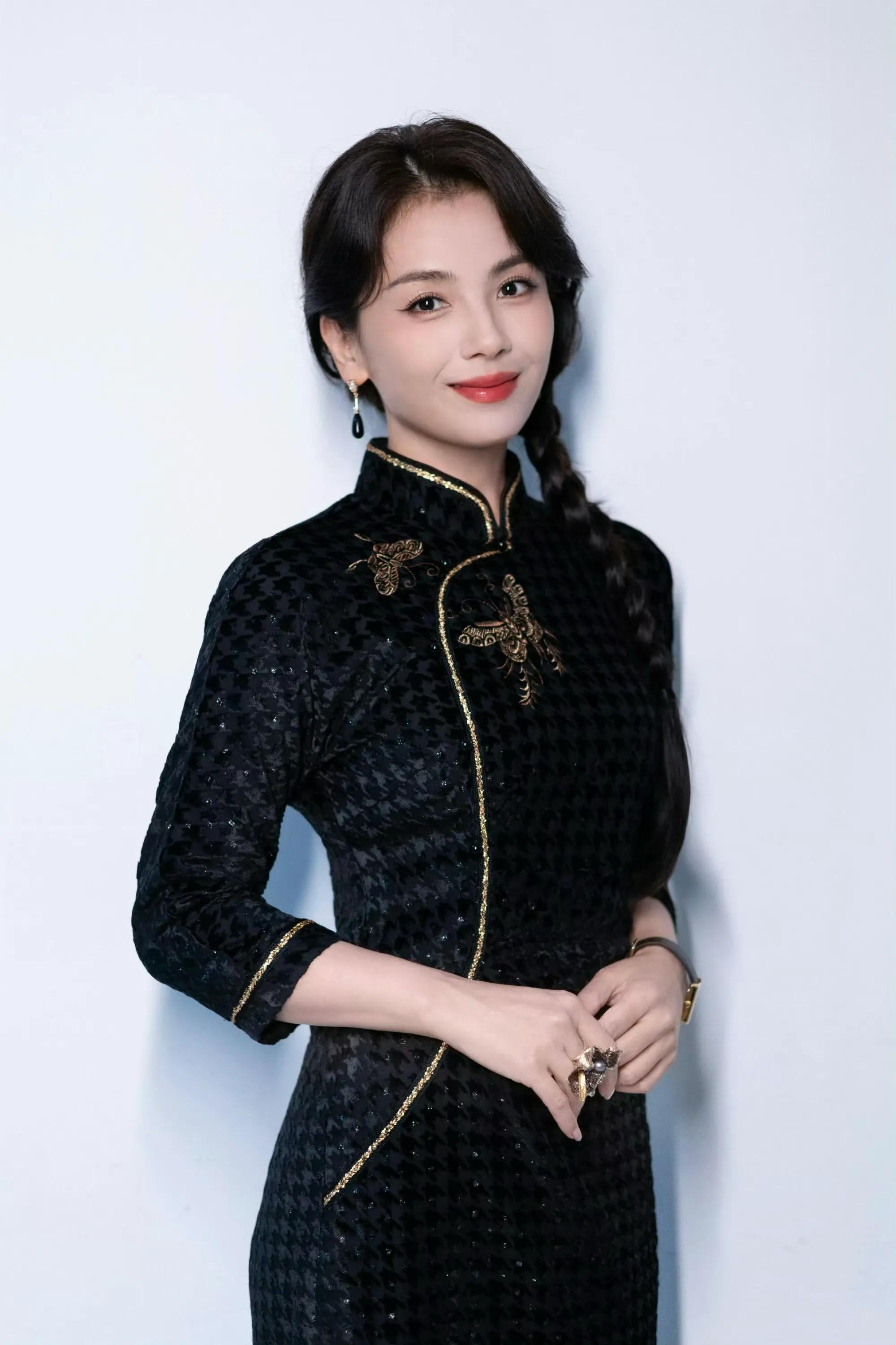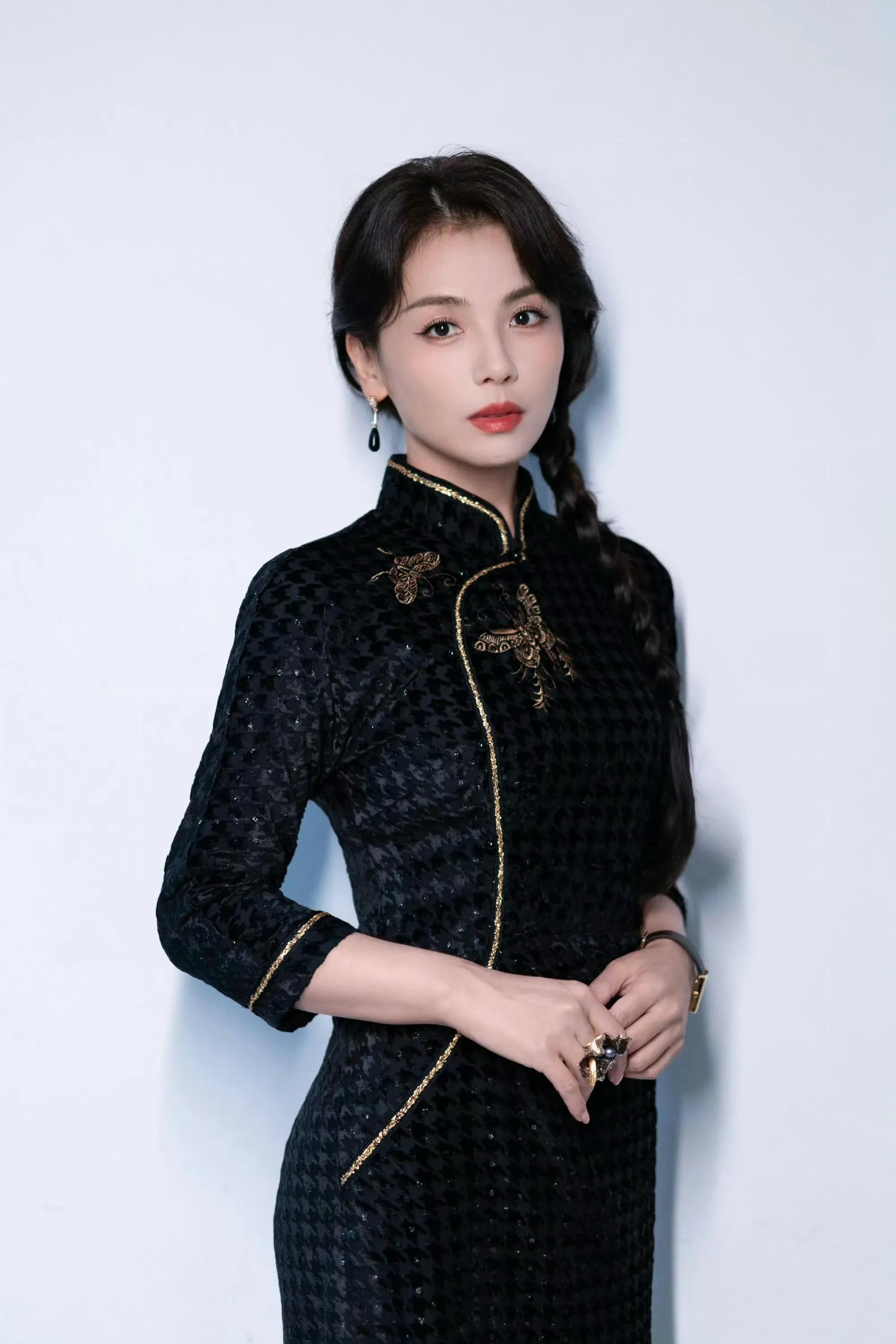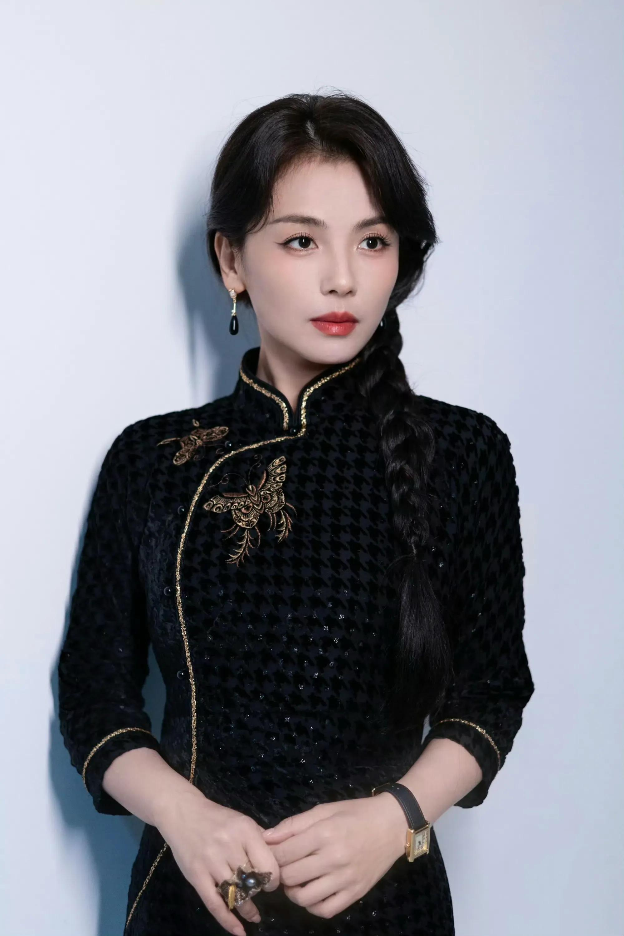 刘涛一袭黑色复古旗袍搭配麻花辫造型温婉如玉,身姿婀娜秀丽,肌肤白皙水嫩,曲线优美流畅,举手投足间流露出东方女性的优雅魅力