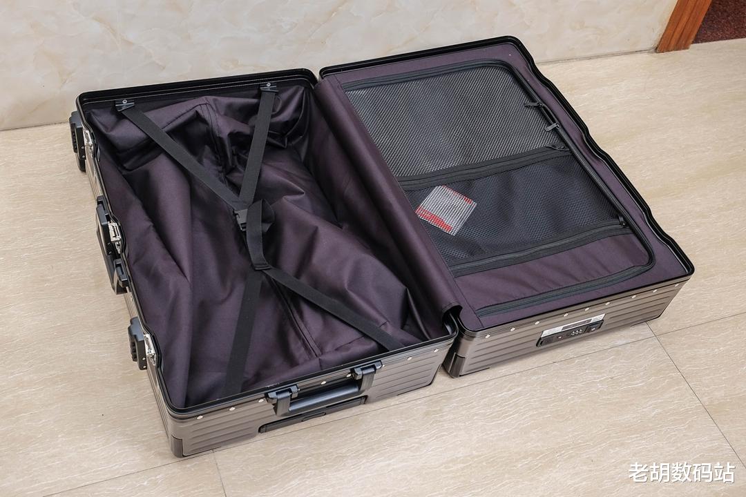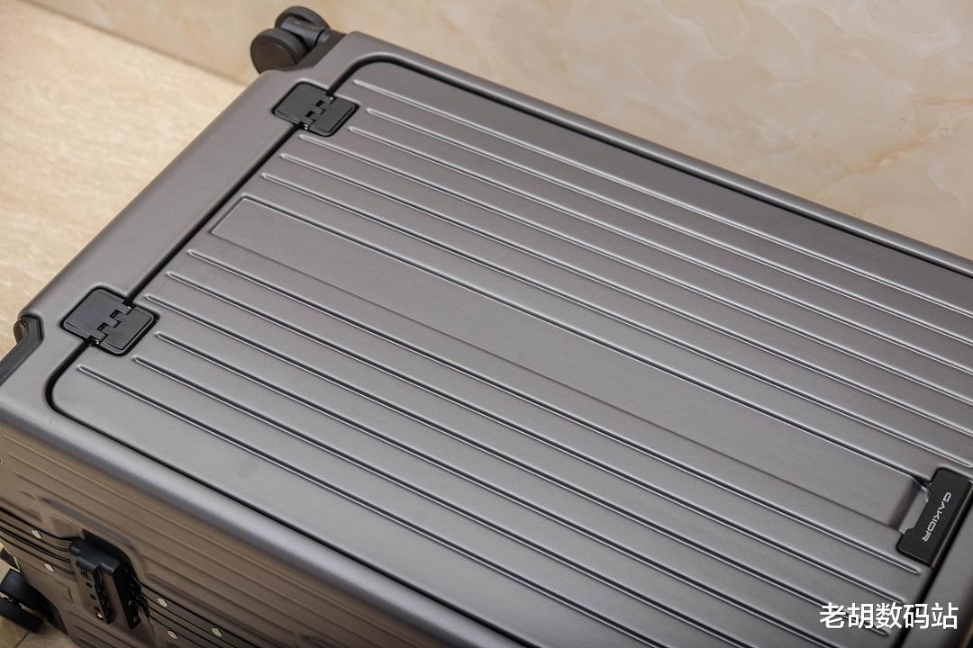 我还专门做了个更实在的测试:空箱合盖,让我这120斤的人直接踩上去站了一分钟。结果很有意思——箱子全程安静,等我下来再看,刚才脚踩的位置已经自己慢慢回弹平复,就像什么都没发生过一样。能做到这样,是因为它在你看不见的地方堆足了料:箱壁用了四层进口德国科思创材质,开合处是双层铝框配航空级铝合页,内部还有双层菱形波浪结构撑着,可承重200公斤,再加上SBAT一体压铸的技术把整个框架牢牢锁在一起,想不结实都难。