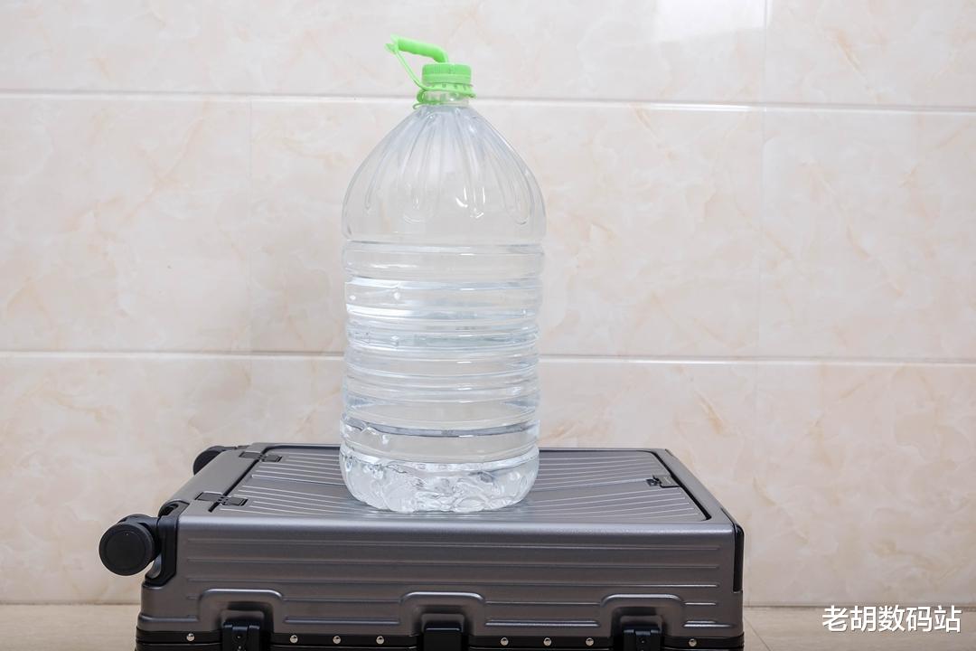 光说坚固可能不够直观,我决定亲自试试——把空箱合上,放上桶装水,重量约36斤左右,静置了1小时,虽说放在下面凹陷了,但是移除后,自动变回原样,并没有变形。