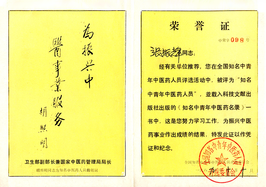 1989年被卫生部组织的'全国知名中青年中医药评选委员会'评为“全国知名中青年中医药人员“。